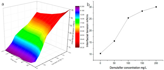 (a). Effect of SE concentration on oil–water interfacial tension; (b). Effect of demulsifier concentration on oil–water interfacial tension of mixed emulsion when SE content is 30%.