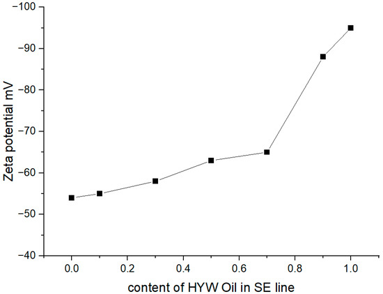 Figure 6 shows the Zeta potential curve after blended different proportions from HYW emulsion and SE emulsion. It can be seen that when the HYW content is 100%, the absolute value of Zeta potential has the highest absolute value, reaching −95 mV. With the decrease of HYW content, the absolute value of Zeta potential gradually decreases. When the HYW content is 70%, the absolute value of Zeta potential decreases the most.