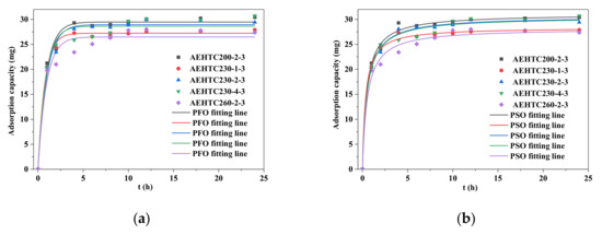 In the adsorption kinetics experiment, 100 mg of the AE-CMIW hydrochar sample was added to separate vials containing 40 mL of a 100 mg/L mixed solution. The vials oscillated at 40 rpm/min for 1, 2, 4, 6, 8, 10, 12, 18, and 24 h. The adsorption capacities for MB and metal ions were measured and calculated. Pseudo-first-order (PFO) and pseudo-second-order (PSO) kinetic models were employed to describe the adsorption behavior of AE-CMIW hydrochar [39]. The PFO and PSO models are expressed by Equations (2) and (3), respectively: