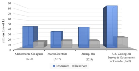 Prior to discussing the global availability of lithium, it is important to address the difference between reserves and resources and assess the available amount of lithium accordingly. Resources are geological stock that has been identified and could be mined with better technology, whereas reserves refer to the amount of lithium available for exploitation with the existing technological and socioeconomic conditions; therefore, lithium reserves are the existing sources for lithium production present in the world [30,33].