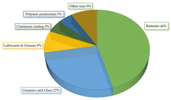 Lithium is a versatile material used for a wide range of applications. The major Li products are used in the manufacture of lubricants, ceramics, glass, synthetic plastics, rubber, pharmaceutical products, and metal alloys [19,76]. Lithium stearate is used in automotive, military, industrial, aircraft, and marine sectors as a high-temperature lubricant grease. The lithium-based grease provides high resistance to water, does not react with oxygen, and does not solidify at low temperatures.