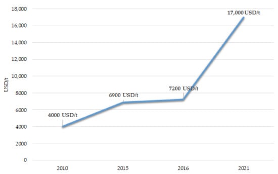 The increasing demand for lithium is affecting the price of the metal. In addition, lithium deposits are concentrated in a small number of countries; therefore, there is only a limited supply of this element, a factor that also determines the price of the metal. As shown in Figure 3, in 2010, the lithium carbonate price was under 4000 USD/t, and at the end of 2015, the value rose to 6900 USD/t. This is an increase of 56% in just five years. By 2016, it amounted to 7200 USD/t [26], and in 2021 the average price was estimated at 17,000 USD/t [57]. The price of lithium in the world market will continue increasing as demand is expected to outstrip supply. Financial institutions affirm that supply could be stretched to meet the current demand; however, the response might not be enough to contain the lithium price [94].