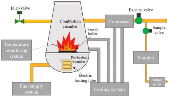In this experiment, the aerosol generation and sample collection were realized using an integrated high-temperature experiment apparatus. The schematic diagram is shown in Figure 1 []. The apparatus uses preheated kerosene as fuel to simulate the combustion environment. A two-stage cooling system composed of water and coolant was used to cool the combustion chamber and exhaust ducts. The generated aerosol was led out of the system through a ventilation system. In order to monitor the operating status of the system, thermocouples were installed in the combustion chamber and the front section of the exhaust valve and integrated into the temperature-monitoring and -recording system. The collection of aerosol samples was achieved using an impactor sampler with a glass-fiber filter. The mass median diameter (MMD) of the impactor and the range of the collected particle size are shown in Table 2.