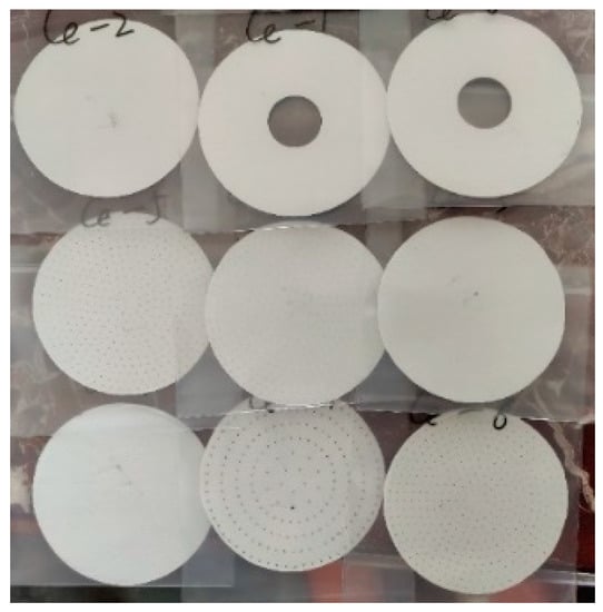 The filter paper after cerium-aerosol sampling is shown in Figure 3, from right to left and top to bottom, with stages 0–7 and F, respectively. The first line is 0, 1, and 2 stages from right to left. The second line is 3, 4, and 5 stages from right to left. The third line is 6, 7, and F stage from right to left.