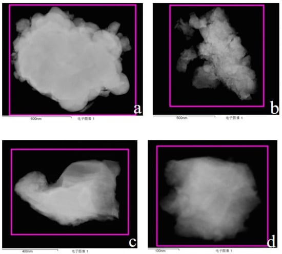 Figure 5 shows the TEM images of the cerium aerosol. Table 7 shows the corresponding semiquantitative analysis data. It can be seen from Figure 5 that the particle size selected for analysis was between 400 and 1200 nm, and the particle was irregular. Figure 5a,b clearly show the adsorption of small particles, indicating that the independence and dispersion of the cerium aerosol particles were not good, and there were aggregation and clustering phenomena. From the atomic ratio composition in Table 7, it can be seen that the chemical composition on the surface of the colloidal particles was mainly cerium oxide.