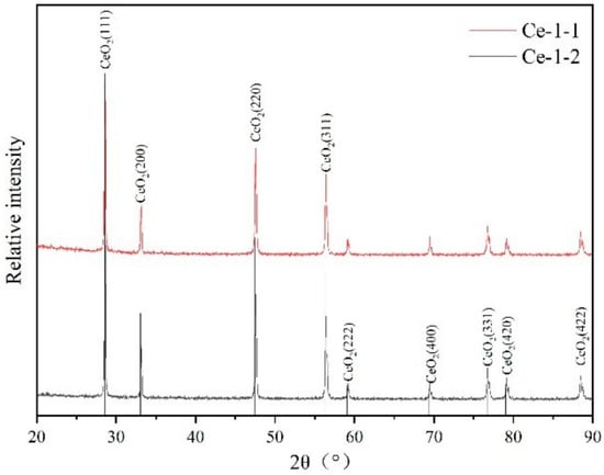 The results of XRD analysis of combustion products of Exp. 1-1 and Exp. 1-2, for example, are shown in Figure 6. It can be seen that the 2θ peak of the product and the standard peak of CeO2 in the PDF2-2004 card can be corresponded within 90°, indicating that the main component of the product was CeO2, and it contained almost no impurities, indicating that the metal cerium sample was fully oxidized under burning.