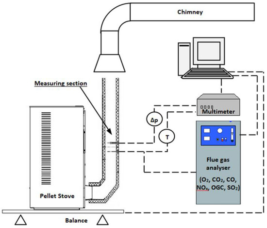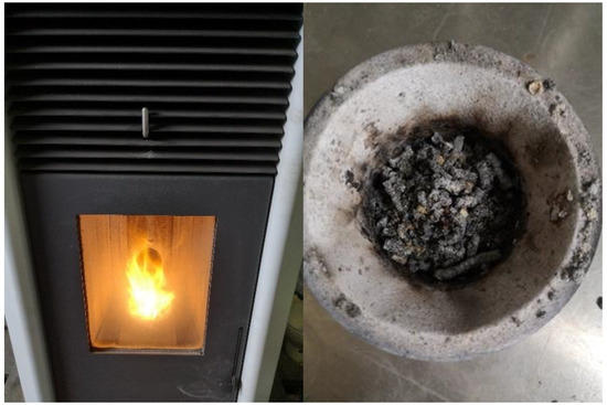 Harmful emissions during the burning of pellets in the special burning implement (Figure 1) were determined according to the requirements of the standards LST EN 14785:2006 [31] and LST CEN/TS 15883:2009 [32]. The pellets were burned in a 5 kW residential space heating appliance for 8–10 min. The heating appliance maintains the smoke temperature at 200 ± 5 °C, and the flue draught in the measuring section is maintained at 13 ± 1 Pa. CO, CO2, NOx, and OGC emissions were determined using three different analyzers: IR source analyzer Datatest 400 CEM for CO and CO2 determination, chemiluminescent analyzer Topaze 32M for NOx, and flame ionization analyzer VE7 for OGC.