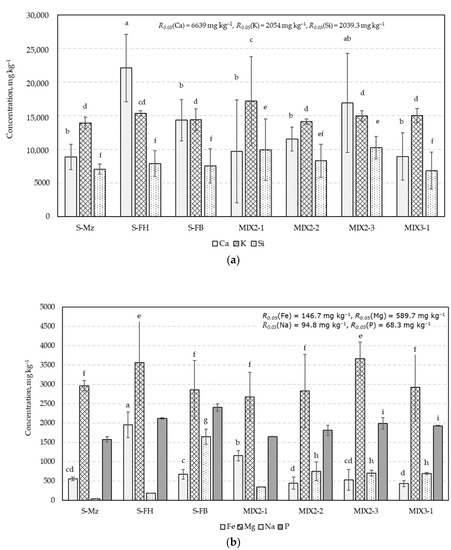 Results of macronutrient analysis of produced pellets: (a) Ca, K, and Si analysis; (b) Fe, Mg, Na, and P analysis. In the figures, any two samples with a common letter are not significantly different, as assessed using the least significant difference.