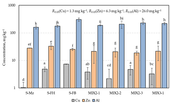 Results of Cu, Zn, and Al analysis. In the figure, any two samples with a common letter are not significantly different, as assessed using the least significant difference.