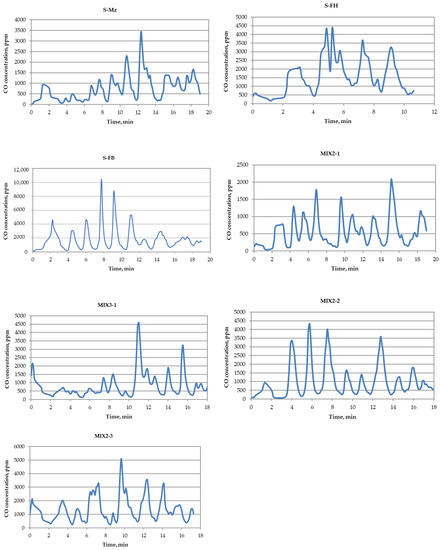 The lowest CO2 emission was determined when burning S-Mz pellets (3.5%), and the highest when burning MIX2-1 and MIX2-2 pellets (4.3%). However, CO2 emissions when burning the pellets of all 7 samples were lower than when burning wood biomass pellets of the control variant (5.6%). When evaluating CO, CxHy, and NOx emissions of all seven pellet samples, significant differences were observed. The lowest CO and CxHy emissions were determined when burning MIX2-1 pellets (572 and 29 ppm, respectively) and the highest when burning S-FB and S-FH pellets (1778 and 144 ppm). The lowest NOx emissions were determined when burning S-Mz pellets (124 ppm) and the highest when burning S-FB pellets (270 ppm). However, CO, NOx, and CxHy emissions when burning pellets of all seven samples were higher than when burning wood biomass pellets of the control variant (Table 4) because quality wood biofuel pellets were only used as a control option, they are used in combustion and emission studies using different types of plant biomass.