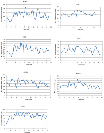 The usability of the pellets is also characterized by harmful emissions produced during burning. The determined harmful emissions during the burning of pellets of all 7 samples are presented in Table 3. The changes in CO and NOx concentrations during the burning of the pellets of the 7 samples are shown in Figure 5 and Figure 6. The combustion process of sample of MIX3-1 pellets is presented in Figure 7.