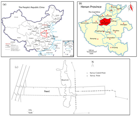 The Peigou Coal Mine is located in Zhengzhou mining area of the Henan Province, China (Figure 2a,b). The panel 31,071 has a width of 130 m, a strike length of 1100 m (Figure 2c), an average mining height of 7.5 m, an average incline angle of 15°, and an average burial depth of 300 m. The mining method is a fully mechanized top-coal caving. The roofs of the mining coal seam are mainly fine sandstone and sandy mudstone. The sandstone fissure aquifer of lower Shanxi formation is the upper main aquifer in the local coal mine, and this aquifer is widely distributed in the entire coal mine with an average thickness of 37.13 m. The distance between the bottom interface of this aquifer and the coal seam is approximately 6 m. The aquifer consists of sandstones with medium and coarse grain sizes. Moreover, fractures have been found in certain local regions of the aquifer. In general, the aquifer in Shanxi formation exhibits poor permeability and a weak water yield property. However, there is a reservoir called Modongwang Up Neath (panel 31071), where the risk of reservoir water inrush is high. In order to accurately evaluate the impact of mining damage on Modongwang reservoir and its dam, a surface movement survey station is established on the surface above the panel. Before mining, movement survey lines in the strike and the inclined directions are arranged on the surface above the panel (Figure 2c).