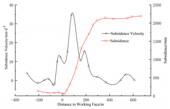 Figure 3 shows the variation curves of the subsidence velocity and subsidence value at the survey station QZ in the surface strike survey line. Due to survey error, surface subsidence also occurs when the working face is distant. Therefore, this paper mainly considers the increase in subsidence velocity as the basis for judging the beginning of the mining influence. When the distance between the working face and the survey station is about 54 m, this station begins to subside. It can be determined that the working face’s leading distance is 54 m, and the advance effect angle is equal to 79.27°. When the working face passes over this station, the subsidence velocity increases gradually, and then at a distance of 76 m, the subsidence velocity reaches its maximum value of 38.36 mm/d. The surface position subsides most violently at this point. Then, the subsidence velocity gradually decreases, and the subsidence curve of the maximum subsidence position essentially flattens out. When the working face passes over this station by roughly 296 m, the subsidence velocity of this station is 1.67 mm/d, the active phase of the station subsidence ends, and the recession phase starts. Then, the subsidence velocity of this station slows down, and its subsidence value becomes stable at 2140 mm.