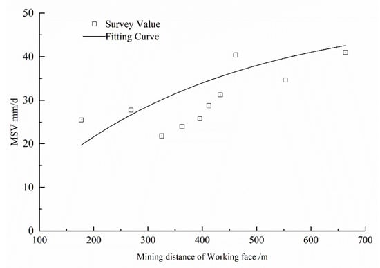 Considering the surface subsidence curve of the numerical model as an example, the MSV of the surface is fitted according to the analysis method of the surface dynamic movement, as shown in Figure 4. The functional relationship between the surface MSV and the mining distance is obtained: