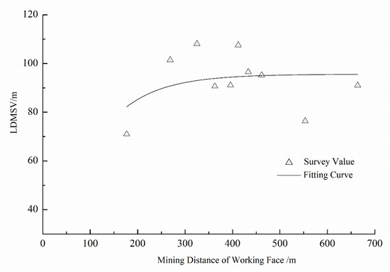 Figure 5 illustrates the relationship between the LDMSV and the mining distance as an exponential function. The LDMSV significantly increases with the mining distance before the latter is advanced to 400 m. When the working face reaches supercritical mining, the LDMSV gradually flattens, increases to a certain extent, and then essentially does not increase, maintaining stability at 95.50 m; namely, the lag angle of MSV is 71.47°. It shows that in the mining process in this coal mine, the proportion of mudstone and sandstone in the overlying strata is large, and the overlying strata structure is weak. As the goaf area increases, the strata movement is quickly transmitted to the surface, resulting in a large lag angle for the MSV on the surface.