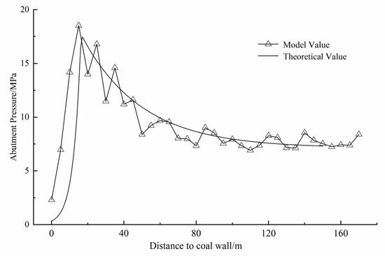 As shown in Figure 6, the peak abutment pressure of the coal seam is 17.50 MPa, the stress concentration factor K is 2.49, the distance between the peak abutment pressure and the coal wall is 16.21 m, and the influence distance before the peak abutment pressure is 65.86 m. According to the numerical simulation, the abutment pressure peak value is located 15 m near the front of the coal wall, and its peak value is 18.52 MPa. The errors of peak stress value and peak position are 5.51% and 8.06%, respectively. Moreover, according to the fact that the ground pressure of the headentry and tailentry of the panel is apparent in the area of 14~17 m, the correctness of the numerical model for the calculation value of abutment pressure is verified.