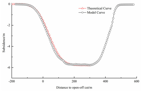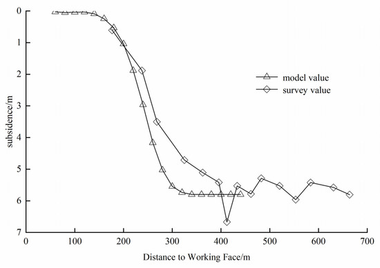 The subsidence data of the surface are extracted with the mining distance of 440 m, and the numerical model subsidence curve is obtained and used for comparison with the data calculated by the probability integral method. The subsidence curves of the measured data and numerical model are shown in Figure 7. It can be surveyed that the subsidence coefficient q is 0.80 with supercritical mining. The maximum subsidence obtained by the numerical model is 5.78 m, i.e., the subsidence coefficient is 0.77, and thus the error rate is 3.66%. It can be considered that the measured results and the numerical model results are consistent in terms of accuracy and distribution law. This shows that the numerical model can accurately inverse the rock strata movement and can be used as an effective means to study the law of overlying strata and surface movement [36].
