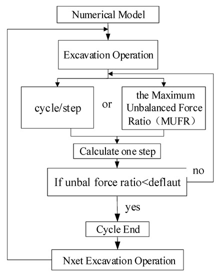 In the discrete element numerical simulation software, the calculation of the model is mainly controlled by two different methods [37]. The first method is by setting the number of the software’s operation cycle steps, and stopping the operation before moving on to the next stage. Moreover, the operation will stop or move on to the next stage if the maximum unbalance force ratio (the ratio of the maximum unbalanced force to the initial unbalanced force) is less than the default value even if the number of calculation steps has not reached the set cycle steps. The second method is by setting the maximum unbalanced force ratio (MUFR). When the maximum unbalanced force ratio calculated by the software is less than the aforementioned set value, the operation will stop or move on to the next stage. The calculation principle is shown in Figure 8.