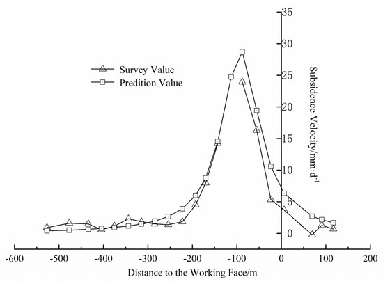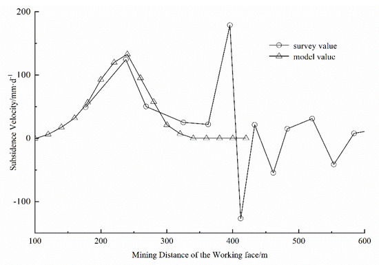 When the working face mining distance is equal to 360 m, the subsidence velocity calculation points on the strike major section of subsidence basin at different mining distances are obtained according to Equation (13) and compared with the measured values, as shown in Figure 13.