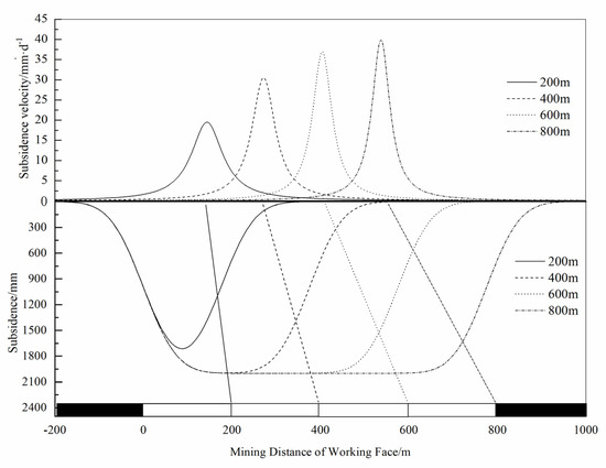 In summary, the variation of the subsidence velocity curve with the mining process can be described as follows: With the increase in the goaf area, the MSV gradually increases, the subsidence velocity curve shape gradually becomes steep, and the LDMSV gradually increases. When the working face reaches supercritical mining; namely, the working face mining distance exceeds 400 m, the subsidence velocity curve of the strike major section maintains a certain lag distance with the working face in a fixed form and moves forward with the mining. Figure 12 shows the relative position of the subsidence and subsidence velocity curves of the strike major section of the surface, when the working face mining distance is 200m, 400m, 600m, and 800 m, respectively.