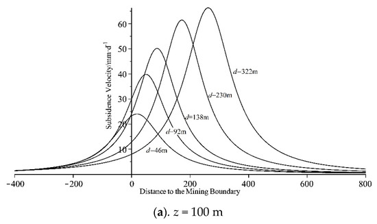 According to the above analysis of the MSV and the LDMSV on the strike major section of the surface in Peigou Coal Mine, it is known that in Equation (17), V0 is equal to 50.40 mm/d, and the correction coefficient aL of the LDMSV is equal to 1.22. Bringing the above parameters into Equation (17) results in the calculation formula of the subsidence velocity of the surface and overlying strata. When the mining velocity is 2.3 m/d and the mining time is selected as 20d, 40 d, 60 d, 100 d, and 140 d, the subsidence velocity distribution curves of the rock strata with the depths of 100 and 200 m, respectively, are shown in Figure 5, Figure 6, Figure 7, Figure 8, Figure 9, Figure 10, Figure 11, Figure 12 and Figure 13.