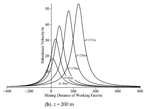 It can be seen from Figure 14 that the subsidence velocity of rock strata shows the following laws: First, the peak value on the subsidence velocity curve gradually increases with the increase in mining distance, and when the working face mining reaches supercritical mining, the increase amplitude of the MSV gradually decreases, finally stabilizing at a certain value. In addition, the shape of the subsidence velocity curve of the rock strata becomes steeper with the increase in mining distance, and finally tends to have a stable shape. Finally, the LDMSV of the subsidence velocity curve increases gradually with the increase in mining distance. In general, the peak value of the rock subsidence velocity curve gradually increases, and the curve shape gradually becomes steep during the mining. When the mining distance reaches a certain value, the peak value and shape of the rock strata subsidence velocity curve tend to be stable and maintain a certain lag distance from the working face, moving forward with the mining of the working face. By comparing Figure 14a,b, it can be found that with the same mining distance, the mining-induced influence of the strata close to the coal seam is greater, resulting in a larger MSV of the rock strata, a smaller LDMSV, and a steeper shape of the subsidence velocity curve.