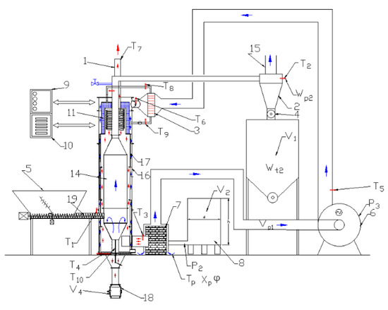 In addition to using the basic elements of a typical fountain drier, i.e., furnace 7, fan 6, drying chamber 14, sawdust screw feeder 19, cyclone 2 [8], the device has been additionally equipped with a heat recovery system 11 (Figure 1) and a system for capturing exhaust pollutants, presented and discussed in Section 3.