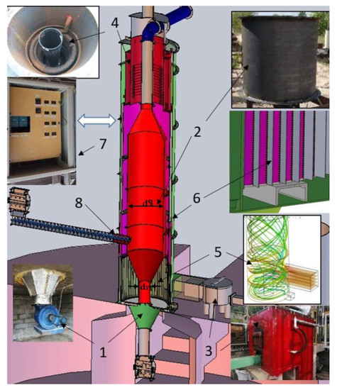 Figure 2. The fountain dryer modified parts. 1—dirt separator; 2—drying chamber segment; 3—furnace for burning waste; 4—water heat exchanger; 5—direction of exhaust gases in the drying chamber; 6—ribbed heating surface; 7—measuring cabinet; 8—variable pitch screw feeder.