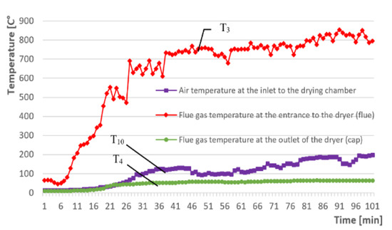 The temperature of 200 °C inside the drying chamber was reached after 5000 s of dryer operation for exhaust gas temperatures in the range of 800–850 °C.