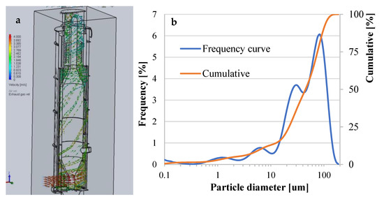 Figure 5. (a) Computer simulation of the exhaust gas flow velocity inside the drying chamber. (b) Particle distribution obtained from the exhaust gas.