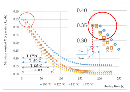 It is noteworthy that the period of inertia of a given mass of sawdust heating is visible (see the enlarged beginning of the chart). This time is from 5 to 10 s (from Tmin to Tmax). The higher the drying temperature, the shorter the time of the process. Moisture evaporation during this period is very low. The drying curves also revealed that the drying time, for example for 15% humidity, varies from 78 to 49 s, for 100 and 175 °C, respectively, and comparing these results with other research works [15], it should be stated that the drying time of the shavings of 15% moisture content is comparable, or in comparison with the literature [15,20,21], is even shorter.