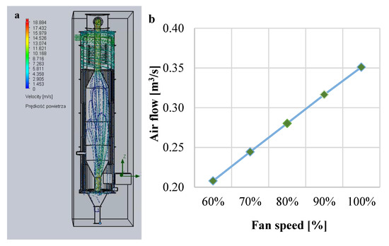 The data presented in Figure 7a,b show that for 90% of the fan settings, the airflow is 0.316 (m3/min). Computer simulations (see Figure 7a) performed for the airflow velocities inside the drying chamber are made for the temperature of the combustion gases, which is equal to 850 °C. Analyzing the simulation presented in Figure 7a, one can see that the air velocity inside the drying chamber is about 2.9 m/s, whereas the velocity in the outer casing (16, 17) is 1.5 m/s, which is twice as slow. This is an intended design effect aimed at extending the air heating time. The air inside the drying chamber has turbulence, which contributes to better mixing of the raw material inside the chamber.