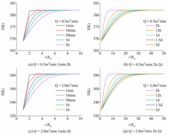 It can be seen from Figure 2 that when the injection rate increases from 0.5 m3/min to 2.0 m3/min, the bottom hole temperature decreases from 368.97 K to 328.83 K, a decrease of 40.14 K. Under a different injection rate, the formation near the bottom of the well has an evident temperature drop with the increase in time, and the influence range gradually expands. In addition, it can be seen from Figure 2 that the injection rate has little influence on the range of formation temperature drop.