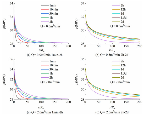 Figure 3 shows the distribution of pore pressure near the wellbore formation with time and radial distance under different injection rate (0.5 m3/min, 2.0 m3/min). It can be seen from Figure 3 that under the same wellhead pressure, when the injection rate increases from 0.5 m3/min to 2.0 m3/min, the bottom hole pressure increases from 32.35 MPa to 34.17 MPa, an increase of 1.82 MPa. This is because the pressure increment caused by the increase in gravity is greater than the frictional pressure drop increment caused by the increase in injection rate. Under a different injection rate, the formation pore pressure near the bottom hole increases with the increase in time, and the influence range increases. In addition, it can be found that the sweep velocity of bottom hole pressure is significantly higher than that of bottom hole temperature by comparing Figure 2 and Figure 3.