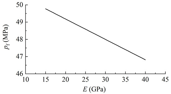 Ding et al. found that the strain difference that the core can withstand decreases and the elastic modulus increases after intrusion of CO2. According to Equation (10), when the bottom hole fluid temperature is low, the initiation pressure decreases with the increase in elastic modulus. Figure 7 shows the change in the fracture initiation pressure with the elastic modulus. It can be seen from the figure that the fracture initiation pressure decreases linearly with the increase in elastic modulus.