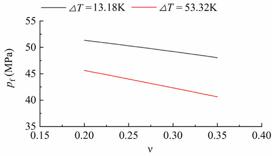 It can be seen from Figure 8 that under different temperature differences, the reservoir fracture initiation pressure decreases linearly with the increase in Poisson’s ratio. The reservoir pressure decreases with the increase in temperature difference between the bottom hole and the reservoir.