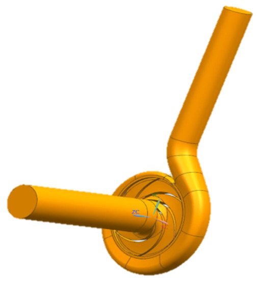 The cantilever centrifugal pump model adopted for our study was the IS-65-50-160 single-stage, single-suction pump with number of blades Z = 6 and specific speed ns = 81.5. The basic performance parameters were as follows: flow rate Q = 50 m3/h, head H = 34 m, and speed ne = 2930 r/min. We performed a three-dimensional hydraulic modeling of the test pump’s components using Unigraphics NX, which contains four calculation domains, namely, the inlet section, impeller, worm gear housing, and outlet section (Figure 1).