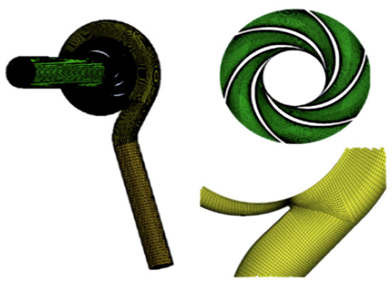 We performed a structured hexahedral meshing of the model pump’s four calculation fields using ICEM software. To improve the numerical simulation’s reliability, it is also essential to confirm the grid independence. The higher the number of grids, the smaller the amount of numerical calculation errors due to the number of grids [14]; however, too many grids will also consume a lot of computational resources. Therefore, we utilized four sets of structured grids with different grid numbers for single-phase constant-flow calculation, and we used the centrifugal pump head’s variation under design conditions to determine the suitable grid numbers. Table 1 shows that when the number of grids goes beyond 291,000, the head ceases to alter. Therefore, we chose the third grid solution, as illustrated in Figure 2.