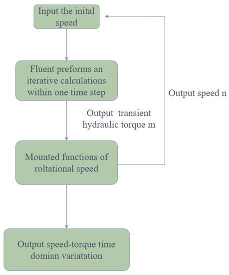 Using Fluent’s UDF function, we input the transient hydraulic moment m at each step of the centrifugal pump’s non-constant flow calculation output into the mount function by writing the definition EXECUTE_AT_END macro, while the estimated rotational speed served as the starting point for our calculation of the following time-step iteration. Figure 3 shows the running flow.