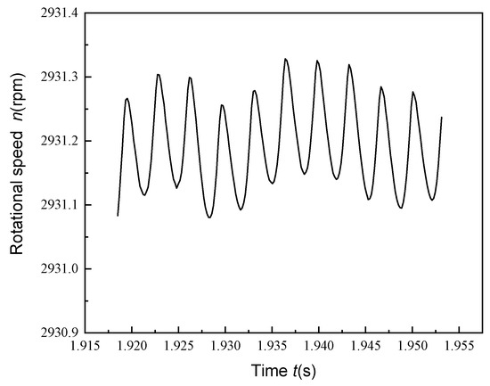 One of the crucial operating factors for centrifugal pumps is rotational speed. Additionally, this is associated with centrifugal pumps’ variations in internal hydraulic torque, which result in small fluctuations in pump speed. In our study, we performed speed correction using the UDF mount function, and the resulting speed fluctuation waveforms were relatively similar in all four operating conditions. As an example, Figure 5 shows the time-domain diagram of the speed fluctuation from the UDF output after the non-stationary numerical calculation stabilization under the cavitation priming condition, and the waveform shows a triangle with obvious periodicity and very small fluctuations near the rated speed.