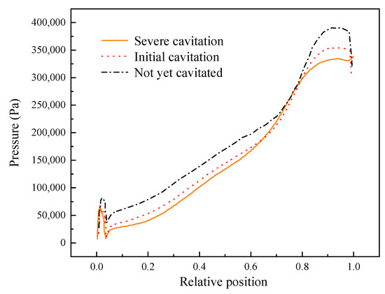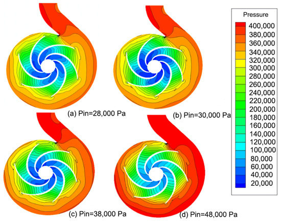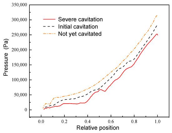 Figure 6a–c show that when the effective cavitation margin is reduced, the blade’s low-pressure suction-surface region begins to increase. When the cavitation phenomenon is more serious, the blade’s low-pressure suction-surface area begins to expand to the front edge of the blade. Figure 6a,b show that, when the effective cavitation margin is lower than the critical cavitation margin, the suction side of the vane’s flow channel is an almost entirely low-pressure area, affecting the pump’s operating performance.