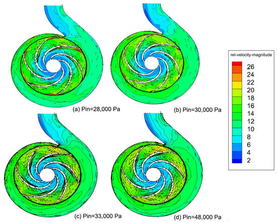 Figure 7 shows the cloud plot of the centrifugal pump’s relative velocity distribution under different effective cavitation margins. Figure 7 illustrates how the impeller flow channel’s relative velocity profile is close to the velocity profile in the steady-state flow field in the non-cavitating condition when the effective cavitation margin is higher than the critical cavitation margin. The cavitation phenomenon only exists in the leading edge of the blade’s suction position, and the impact on the internal flow field is very small. The relative velocity distribution progressively increases along the middle runner of the impeller, and there is a local high-speed area at the posterior edge of the vane’s surface pressure. At the leading edge of the vane’s surface pressure, there is a local low-speed area. Figure 7 shows that when the effective cavitation margin is lower than the critical cavitation margin, the local low-speed area on the pressure side of the blade starts to expand to the impeller runner, causing the blockage of the runner, and there is an obvious local high-speed area at the trailing edge of the blade’s suction side, which keeps expanding in the runner as the effective cavitation margin decreases. The velocity vector diagram shows that the local low-speed region has a secondary reflux phenomenon, which is because as the effective cavitation margin continues to decline, the vacuole expands to the impeller runner, causing blockage and impeding the normal flow of fluid.