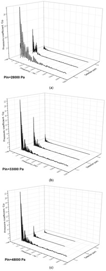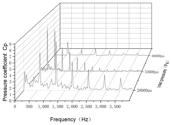 To examine the centrifugal pump’s pressure-pulsation properties under various cavitation scenarios, we used the transient pressure values of the last three flow cycles at each monitoring point under three different cavitation states, and we obtained pressure coefficient frequency-domain maps after converting them into pressure coefficients and applying fast Fourier transform (FFT) to each monitoring point’s pressure coefficient time-domain data.