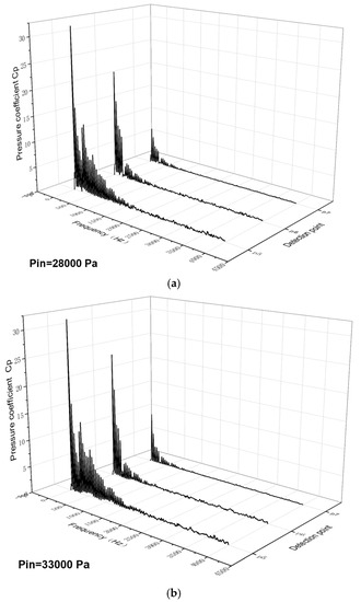 (3) The pressure–frequency-domain diagram of each monitoring point was a discrete distribution, and the main frequency was the blade’s passing frequency ƒ = 293 Hz and its n times frequency. With the deepening of the cavitation, the amplitude of the main frequency in the low-frequency band showed a trend of increasing and then decreasing, and the amplitude of the high-frequency band showed an increasing trend.