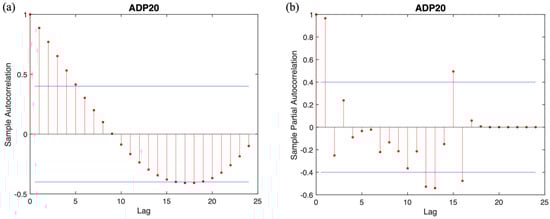 The ACF (a) and PACF (b) of sample ADP20 biogas production time series from day 4. The blue lines are the confidence bounds for a significant correlation. The red lines are the autocorrelation and partial autocorrelation between the current time step and the time steps of different lags.