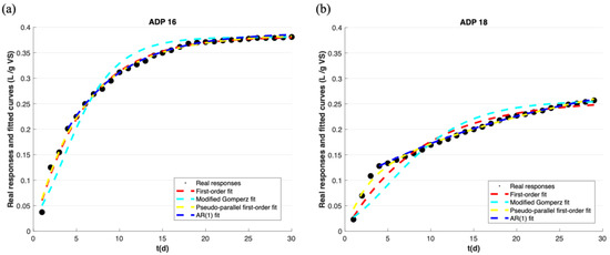 The fitting of the AR (1) model after the initial 3-day rapid biogas production stage was comparable to the PP first-order model, with R2 values of 99% for the majority of samples (Table 5), regardless of Type I or Type II data. Figure 2 shows the fits of three empirical models and the AR (1) model to the cumulative biogas yield in RBP tests.
