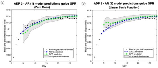 When training the DTs with LOO cross-validation and ADP3 as the test set, the APE of the predicted biogas yield on day 28 using the inferred AR (1) model was 6.87%. This is used as an example for illustration in Figure 3. By accepting one more input each time from the inferred AR (1) model together with the experimental observations of the first three days, the predictions of every one timestep further of the GPR with zero mean and squared exponential kernel were smaller than AR (1)’s predictions for the first few timesteps and then gradually closer to the predictions of the AR (1) model. This was explained by the increased fitted GPR model length scale and vertical scale when receiving more training data. The smaller the length scale, the curvier the underlying function is, and the smaller the vertical scale, the more concentrated the underlying function is around the mean. In contrast, for the GPR with a linear basis function, the predictions surged for the first few timesteps and then approached the AR (1) model predictions. This corresponded to the decreased slope of the fitted linear mean function. In general, given that only one more timestep is predicted at a time, the selection of zero or linear mean function is not of much concern. The 95% confidence interval of the prediction of GPR narrowed when more data were provided.