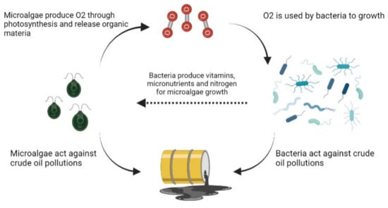 Nowadays, bacteria are widely studied as bioremediators, and several species suitable for this process are known. On the other hand, microalgae could be valid substitutes. For this reason, many studies have focused on bacteria and microalgae collaboration to degrade crude oil and its pollutants. This collaboration can be of various types, but the basic principle sees the microorganisms work synergistically to obtain a better result (Figure 1). For example, Ashwaniy et al. found that the microalga grown in petroleum refinery effluent (PRE) can reduce the concentration of COD, 81% of BOD, 61% of sulphide, 61% of TSS by 70%. 67% phosphorous and TDS and can act as a substrate for bacterial growth in a microbial desalination cell (MDC) to produce clean energy [51]. Chernikova et al. described how microalgae and bacteria collaborate continuously in nature. The microalgae provide oxygen, exopolymers and organic-material useful for bacterial growth. In turn, bacteria support microalgae growth, producing vitamins, micronutrients, iron and carbon dioxide. Furthermore, Chernikova et al., in their work, demonstrated that in two petroleum-enriched microalgae cultures, P. lutheri and N. oculata, there was a selection of hydrocarbonoclastic alpha and gammaproteobacteria, especially Alcanivorax and Marinobacter spp., identifying in total 48 non-redundant bacterial strains also belonging to the genera Thalassospira, Hyphomonas, Halomonas, Marinovum and Roseovarius. These results are interesting as they candidate microalgae as possible host organisms for these bacteria whose housing niches are ignored [52]. Das et al. found that the ability of Chlorella spp. to remove various contaminants supported the growth of aerobic bacteria present in the unsterilized pretreated waters deriving from petroleum processing (PPW). In addition, the bacteria made nitrogen more available by promoting the microalgae biomass [38]. These results confirm the studies conducted by Mahdavi et al. in 2015 where algae produce oxygen through photosynthesis, which is necessary for aerobic bacteria for toxic compounds biodegradation. But the results support the ability of some algal strains to degrade directly and completely, some compounds such as naphthenic acids. In their study, a sample of freshwater taken directly from a pond in northern Alberta was tested for removal. Various conditions were tested, such as the absence of oxygen, presence of a Navicula pelliculosa diatom, and light variations. Only bacteria were tested, and bacteria with algae. The results showed how the algae-bacteria consortium led to an increase in the removal of toxic compounds given by the increase in microbial biomass in the algae-bacteria consortium. The higher rate of detoxification, obtained with bacteria alone, was improved by microalgae, which improved bacterial growth [53]. The coexistence of bacteria and microalgae was also observed by Hodges et al. where filamentous cyanobacteria dominated the reactor used for the decontamination and bio-removal of nutrients and suspended solids petrochemical wastewater [54]. So far, it has been analyzed how algae have been supporting bacterial growth in bioremediation, but Abid et al. have conducted a study in which the opposite occurs. A double-chamber bioreactor was built in which in one the bacteria biodegraded petroleum wastewater and the CO2 produced was channelled into the chamber containing the microalga Spongiochloris sp, which used it to increase its growth, sequestering the CO2 produced by the bacteria from the atmosphere [55]. However, these two paths of mutual exchange are accompanied by a third possibility. Tang demonstrated how a microalgae-bacteria consortium, artificially created, can optimize the removal of different petroleum constituents. In his study conducted in 2010, he separately tested four bacterial strains known for their ability to degrade PAHs (Shingomonas GY2B, Burkholderia capacia GS3C, Pseudomonas GP3A and Pandoraea pnomenusa GP3B) and the microalga Scenedesmus obliquus GH2, both as unialgal and axenic algae. Unialgal GH2 alone was able to remove various contaminants even with high percentages, such as 46% of alkanes and 51% of alkylcycloalkanes, or by reducing PAHs and alkylated naphtalenes by 81%, while axenic GH2 did not show potential for removal. However, these results were disproved by the union of microalgae with bacterial strains. Unialgal GH2, added with the various strains, has not increased its degradative properties, indeed in some cases, it has reduced its efficiency; axenic GH2 in conjunction with the different bacteria, on the other hand, has shown an increase in all degradation rates, completely removing toxic compounds such as PAHs, naphthalene, fluorene and phenanthrene [56]. Although there are not many studies in this regard, Ozhan et al., have shown how the oil spill in southern Louisiana has created dysfunctions in the phytoplankton, which is a valid indicator of toxicity for the health of the compromised marine ecosystem [36]. Jung et al. confirm this and argues that the dose of oil with which the phytoplankton comes into contact is responsible for the imbalance between bacteria and microalgae, reporting that concentrations greater than 1000 ppm inhibit the growth of microalgae by stimulating the bacterial one instead [57].