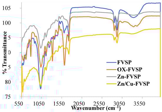 The FT-IR results of these adsorbents (FVSP, Ox-FVSP, Zn-FVSP, and Zn/Cu-FVSP) are summarized in Table 2, and the spectra are displayed in Figure 2.