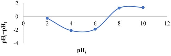 Furthermore, a pH meter and 1 M, 0.1 M, and 0.01 M HCl and NaOH solutions were used to prepare five 0.04 M Na2CO3 solutions with varying initial pH values (pHi) (2–10). Then, 0.6 g of Zn/Cu-FVSP, as the best adsorbent (ideal adsorbent), was blended with 50 mL of each Na2CO3 solution in 100 mL plastic bottles, and then these bottles were sealed and agitated at 155 rpm and 27 °C for 20 h in a shaker incubator. After this, the Zn/Cu-FVSP was removed from each of the five solutions by filtration, and the pH meter was applied again to measure the pHf (final pH) of each solution. Ultimately, the pHi–pHf values were calculated and graphed as pHi to determine the pHZPC of Zn/Cu-FVSP. This method was previously applied by Bani-Atta [46] for the determination of the pHZPC of modified FVSP.